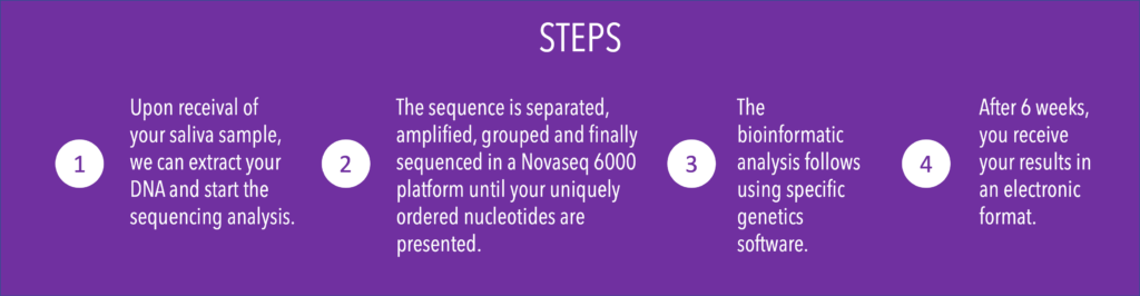 It includes an easy non invasive way of sampling using our saliva DNA collection kit.